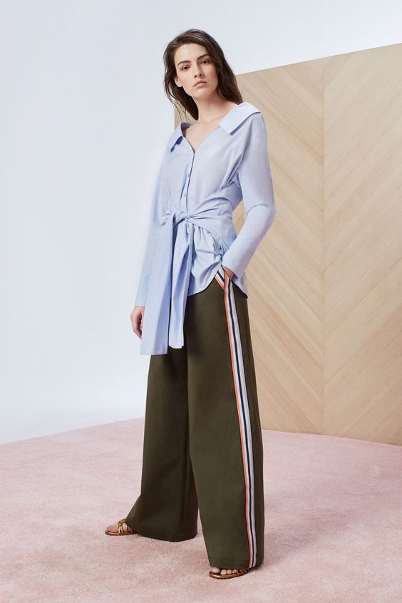 Les blouses en fine bande bleue ne sont pas moins élégantes. Cette tendance n'est pas pertinente pour la première saison. Par conséquent, les modeuses peuvent continuer à faire des images intéressantes avec un tel élément de la garde-robe.