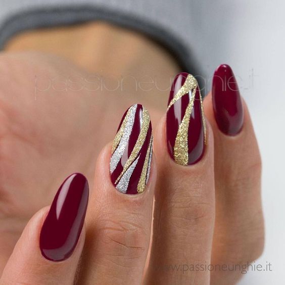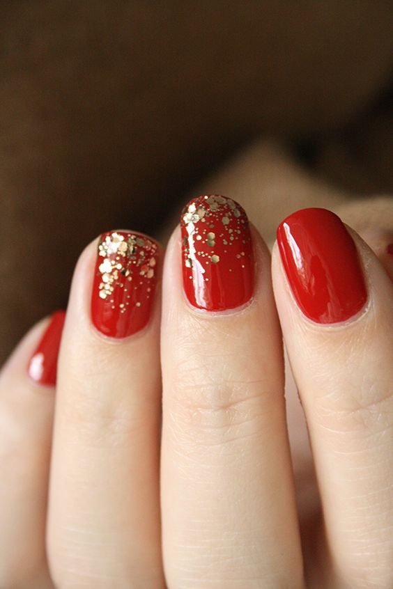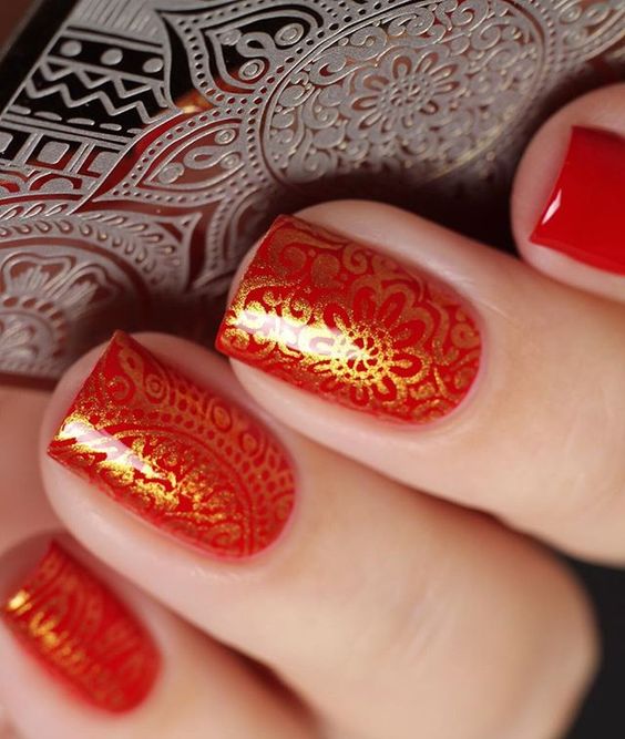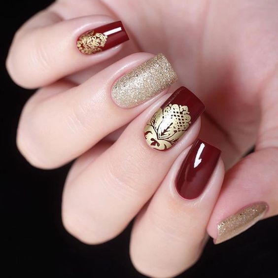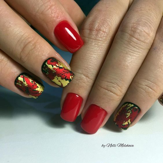 De plus, vous pouvez choisir absolument n'importe quelle nuance de rouge, même de vin ou d'écarlate. En combinaison avec de l'or, chacun d'eux aura l'air vraiment luxueux. Soit dit en passant, le vernis ne doit pas nécessairement être de l'or. N'hésitez pas à choisir des strass dans cette nuance, scotch tape ou même décalcomanies.