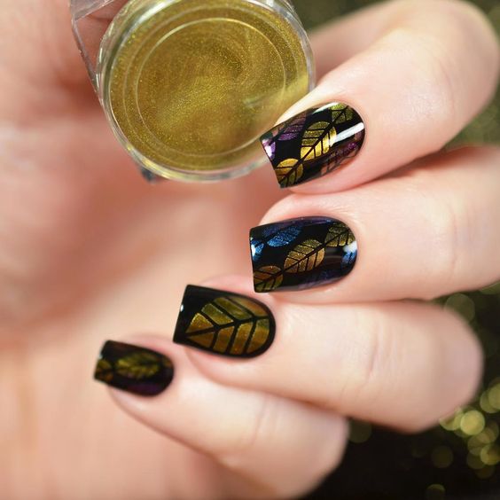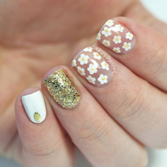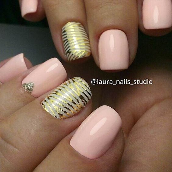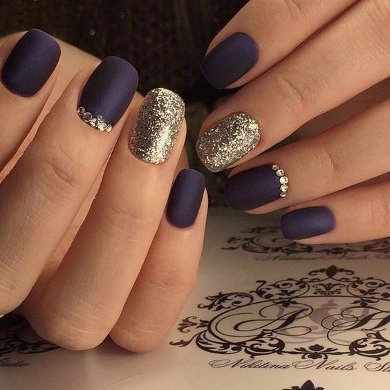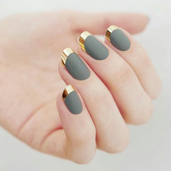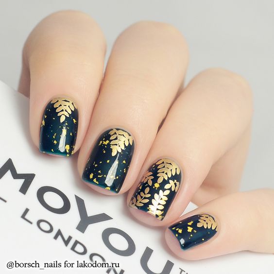 La combinaison de bleu et d'or n'est pas aussi commune que d'autres options. Néanmoins, c'est une excellente solution pour ceux qui ne veulent pas faire un design trop contrasté. Dans ce cas, il vaut mieux utiliser la teinte dorée pour accentuer un ou deux ongles.