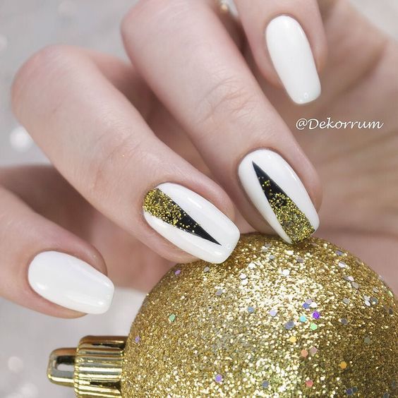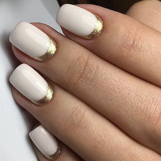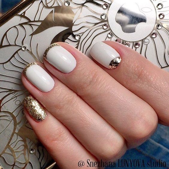 L'une des combinaisons de manucure les plus délicates et féminines est le blanc avec l'or. Le plus souvent, une telle option est choisie par les modeuses modeuses. Si vous le souhaitez, vous pouvez le rendre plus vivant en utilisant un décor supplémentaire sous forme de strass, d'étincelles ou de perles. Mais vous devez le faire avec une extrême prudence afin de conserver le style et les couleurs de la manucure d'origine.