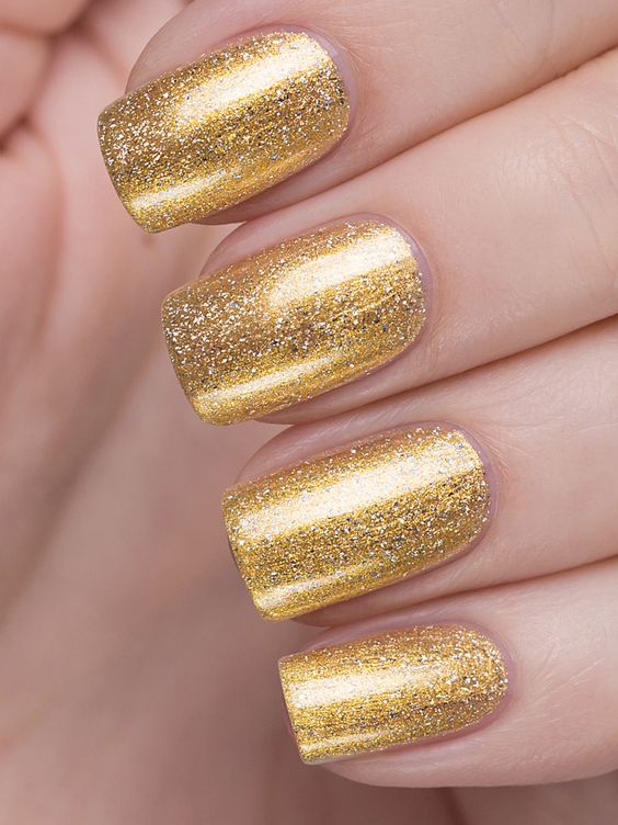Le moyen le plus simple de créer une manucure dorée à la mode consiste à utiliser un vernis à paillettes. Mais gardez à l'esprit que de tels vernis peuvent avoir un effet complètement différent. Le plus souvent dans les magasins, vous pouvez voir une laque d'or avec un chatoiement. Il vous permet de créer la brillance la plus délicate qui ne paraisse pas trop provocante. De plus, c'est une excellente option si vous envisagez de créer une image avec une robe brillante ou trop brillante. En effet, en général, tout sera aussi harmonieux que possible.