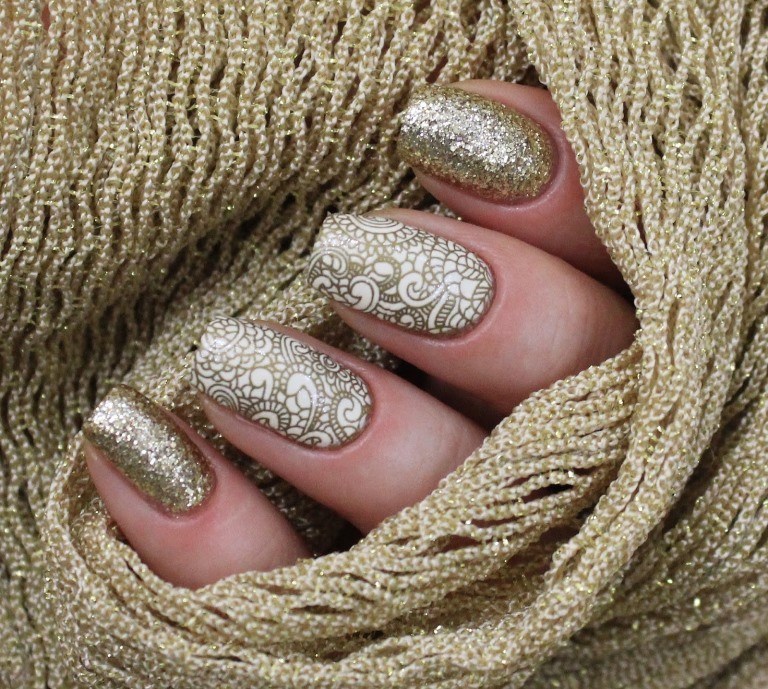 L'option suivante est un vernis avec l'effet de "métal liquide". En le choisissant, vous obtiendrez une lueur douce et uniforme. Une telle manucure est très belle même si vous le faites à la maison. C'est pourquoi il est le plus souvent utilisé pour l'estampage. Pour ce faire, couvrez les ongles avec la teinte principale. À son tour, la couleur or sera utilisée pour transférer le motif sur un ou deux clous. Si vous le souhaitez, vous pouvez compléter une telle manucure avec des strass de petite taille.
