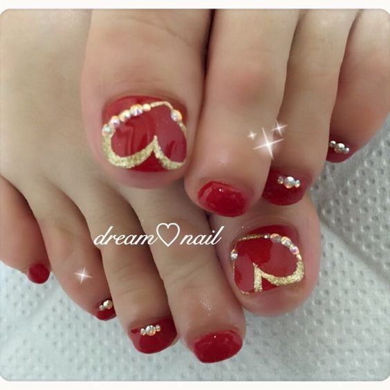 Les impressions de couleur or faites par vernis noir semblent intéressantes. Les dessins réalisés avec du vernis blanc dans une pédicure dorée sont brillants, car la couche dorée nuance parfaitement la couleur blanche. Les ornements de vernis rouge sur fond doré sont appliqués en petites tailles. Très souvent, les maîtres de pédicure utilisent une technique de projection ou de pulvérisation. En plaçant une image sur la surface de l’ongle avec du vernis d’or, il est impératif de relier un fantasme. Les artisans professionnels peuvent créer des chefs-d’œuvre entiers dans les tons dorés sur les ongles de leurs pieds. Les dessins les plus populaires dans une pédicure en or sont: des cœurs, des formes géométriques et une bordure de lune. La veste classique avec la laque d'or semble exquise. Une veste française lunaire en or dans une pédicure a également l’air très séduisante, surtout si elle est complétée par une sorte de caillou scintillant.