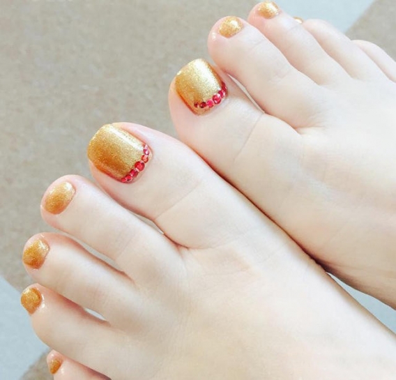 Les pédicures dorées sont de préférence choisies par les femmes à la peau bronzée foncée. Ils essaient toujours de porter des chaussures ouvertes pour montrer toute la luminosité du pédicure doré. Le placage à l’or est très exigeant et de mauvaise humeur. Par conséquent, choisissez-le comme teinte de base pour un pédicure à la mode, soyez prudent. Pour commencer, il est important de faire la pédicure parfaite pour que vos jambes soient parfaites. Et seulement après l'application d'un revêtement de vernis d'or.Si nous considérons la pédicure du point de vue des options estivales, nous pouvons comprendre que la pédicure sur le podium et la pédicure des modeuses des réseaux sociaux sont deux choses différentes. Beaucoup des idées suggérées méritent une attention particulière, y compris une pédicure dorée. Malheureusement, la variété de ce type de clou est un peu boiteuse. Une couche continue de vernis d'or semble trop pathétique et même ennuyeuse. Ce n'est pas approprié partout et pas toujours. Avec l'aide du mica d'or pour la conception du verre, il est intéressant de diversifier la pédicure en or.
