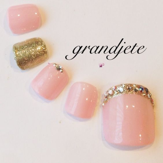 Si vous regardez bien, on peut souvent trouver des pédicures en or dans les films populaires. En effet, la conception lumineuse des jambes féminines attire une attention accrue. Les plaques d’or sur les jambes sont tout simplement condamnées à faire l’objet de toutes les attentions. Mais si vous n'appartenez pas à la catégorie des femmes courageuses, choisissez les éléments dorés de l'ornement. Dans la pédicure dorée, il est d'usage d'utiliser toutes sortes d'options de décoration des ongles. Les éléments brillants, les miroitements, les strass peuvent être complètement appliqués au vernis à l'or ou pour mettre en valeur une certaine partie de l'ongle. Parfois, une pédicure dorée semble extravagante, surtout si elle est complétée par une grande quantité de strass. Dans la pédicure dorée, la règle fonctionne - une interdiction de la conception de nombreux ongles avec des strass. Élément attrayant sur les jambes, le vernis or agit déjà. Où est encore plus d'attention? Les strass, comme d’habitude, sécrètent un ou plusieurs soucis sur les jambes, puis en quantité limitée. Gardez le moins possible de pierres scintillantes dans la pédicure dorée. Il est préférable de placer un grand strazik au centre d'un gros ongle et de l'entourer de petits éléments.