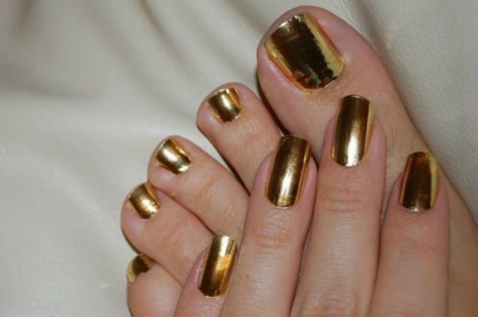 En utilisant de la poudre d'or pour frotter, vous pouvez créer une pédicure dorée époustouflante. Les ongles auront l'effet de revêtement avec une plaque en or. Le revêtement continu de tous les ongles semble élaboré, et les stylistes recommandent donc de ne sélectionner qu'un ongle avec un frottement doré. Si nous prenons en compte la valeur de la couleur dorée selon le Feng Shui, l'attribution d'un clou avec cette nuance symbolise l'attrait de l'argent. La couleur dorée sur l'un des clous du pied gauche indique la réception des mouvements de trésorerie, et sur l'un des clous du pied droit - le retour.